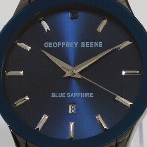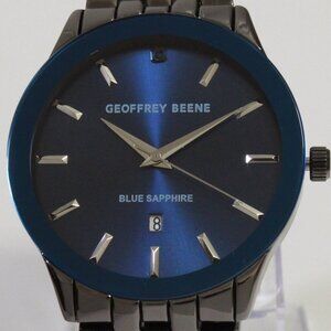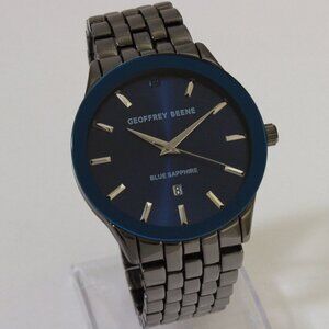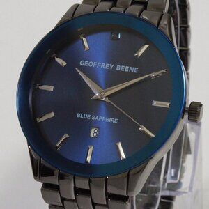 Men's quartz casual watch by Geoffrey Beene featuring a radient blue dial with raised indices and date complication at 6. It's blue bezel and gunmetal finish makes for an elegant casual watch you can wear anywhere. This watch is new in box and works as it should.