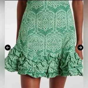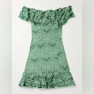 Chic off-shoulder mini dress. Features ruffled neckline and hem. Elegant green pattern.