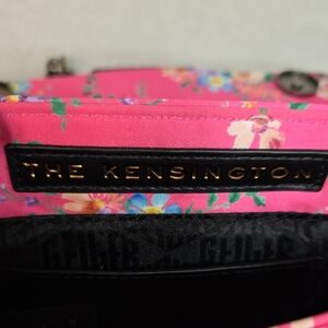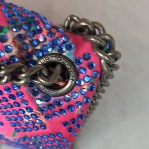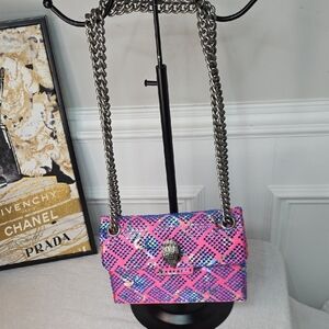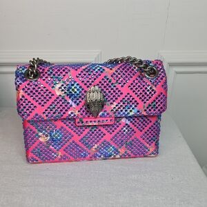 Stylish crossbody bag with pink and blue hues and signature Eagle head. Features eye-catching embellishments. Ideal for elevating any look.