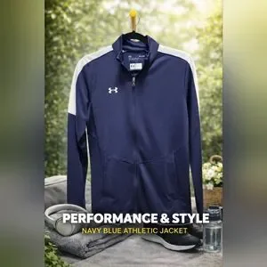 Elevate your performance with this Under Armour jacket. Sleek navy with white accents. Ideal for active wear.