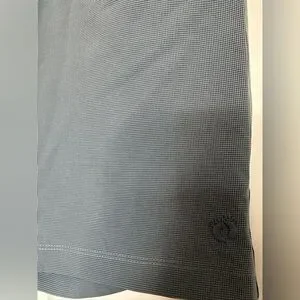 Blue with small check/plaid pattern. Lightweight hybrid, short. Four-way stretch. Comfort waistband. Quick dry. Pockets.