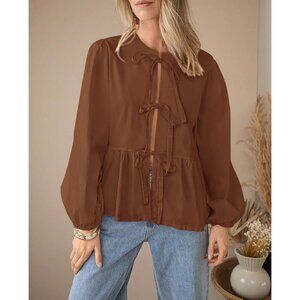 Women's Cotton Lyocell Peplum Blouse Long Sleeve Bow Tie Fall Top
