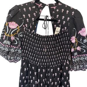 NEW Anthropologie Smocked Black Floral Midi Dress Short Sleeve Size Small $180