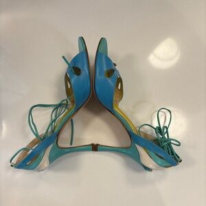Chic BCBGMaxAzria heels with turquoise and white accents. Elegant lace-up design.