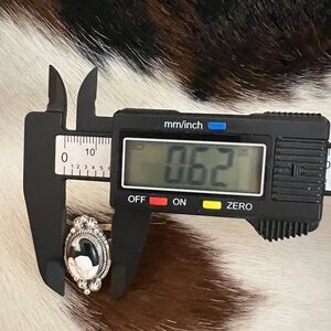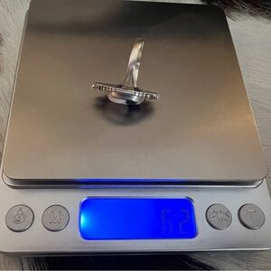 The face of the ring measurements as seen in the photos are 1.06”L x .62”W x .26”D. The stone measures .58”L x .42”W. The ring weighs 6.2 Grams.