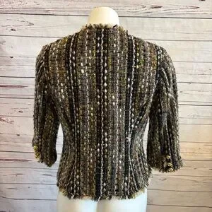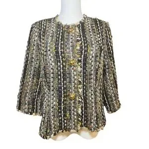 ⦁ Elegant and Timeless Cabi 175 Paris This CABi Tweed Jacket features a textured boucle tweed weave with metallic gold threads and refined fringe detailing. Designed with 3/4 sleeves, a round neckline, gold button details and a chic fringe trim. This jacket is fully lined and its versatile design makes it suitable for layering over blouses or dresses.
