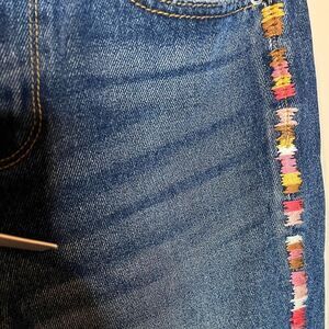 Elevate your wardrobe with these stylish blue jeans featuring vibrant multicolor accents. Perfect for any casual outing.