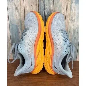 Up for sale is a pair of Hoka Clifton 8 running shoes in the popular Summer Song / Ice Flow colorway (Light Blue with a vibrant Orange/Yellow sole). These are the Wide Width (D) version, offering extra room in the toe box for maximum comfort.