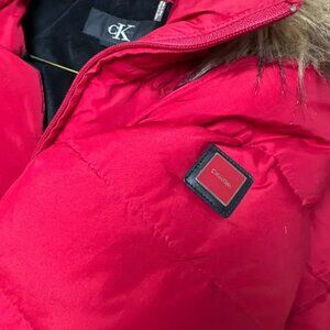 Calvin Klein Women's Red Faux Fur Trim Hooded Puffer Parka