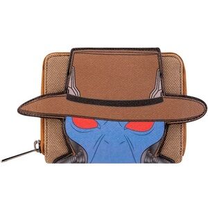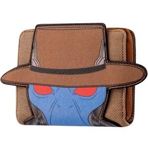 From Star Wars, this wallet features Cad Bane! Featuring incredible detail to bring Cad Bane to life, this Loungefly wallet is made of vegan leather (polyurethane), zips closed with sturdy metal hardware, and has credit card slots as well as a clear slot for holding your ID.