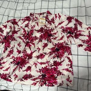Chic blouse with striking floral design. Features white and amaranth floral design. High neck with cuffed sleeves. Loose and flowy. New with tags.