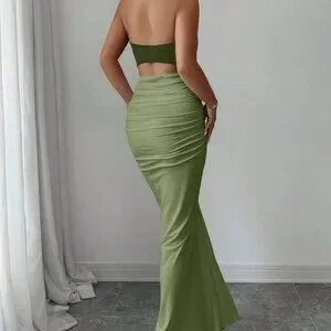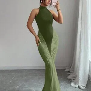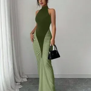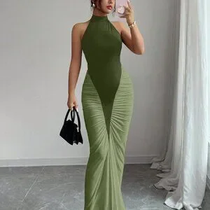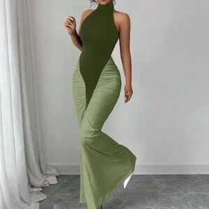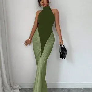 This army green halter neck dress combines a striking color block pattern with a cinched natural waist for a flattering silhouette. The slim‑fit bodycon cut flows into a mermaid‑style fishtail hem, delivering an elegant, elongated look. Long length and regular sleeves add modest coverage, while the mid‑waist line enhances shape without the need for pockets.