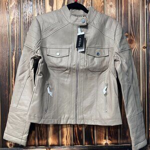 NEW GUESS Women's Faux Leather Moto Jacket In Beige Sz L