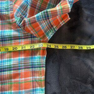 - Color: multicolor plaid in orange, green, blue and white