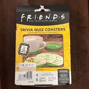 Set of Friends-themed trivia quiz coasters. Features Central Perk design. Includes 40 quiz questions.