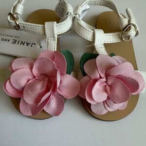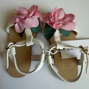 Girls 5, Janie and Jack, Bunny Pink Flower Sandal. White t-strap sandals with large pink flower. Buckles closure. So perfect for Spring and Easter! No flaws, perfect condition. New with tags still attached.