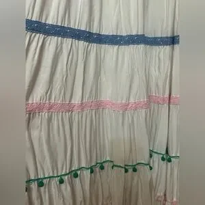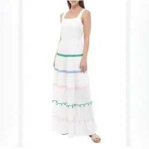 Crown & Ivy White Tiered Maxi Dress with Colorful Pom Pom Trim - Size Large