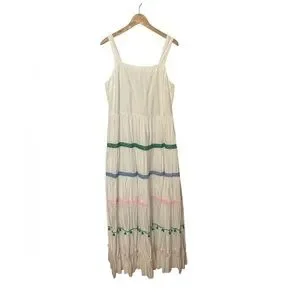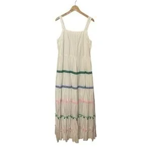 Keywords: Crown & Ivy, White Maxi Dress, Tiered Dress, Pom Pom Trim, Crochet Lace, Colorful Embroidery, Summer Dress, Beach Coverup, Resort Wear, Square Neck, Cotton Maxi, Southern Style, Belk Fashion, NWT.