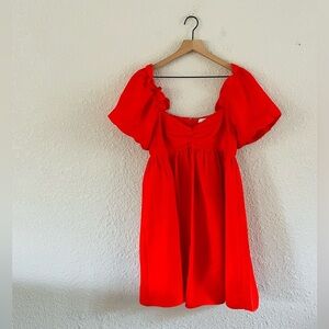 Vibrant red mini dress. Features puff sleeves and a sweetheart neckline. Perfect for a bold look.