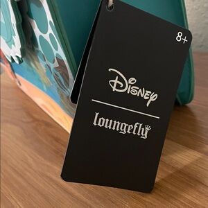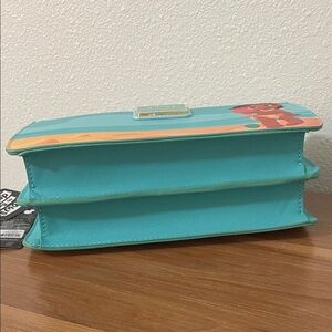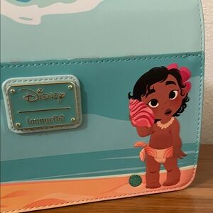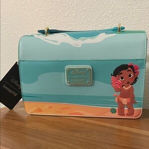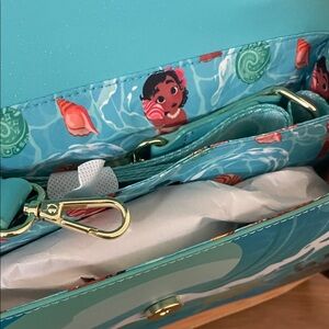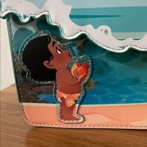 Adorable Loungefly bag with Moana on a beach. Vibrant teal and coral design. Ideal for Moana fans.
