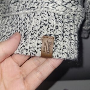 Thick textured knit with a relaxed oversized fit and flattering V neckline. Features ribbed cuffs and hem with signature leather Roots logo tab detail.