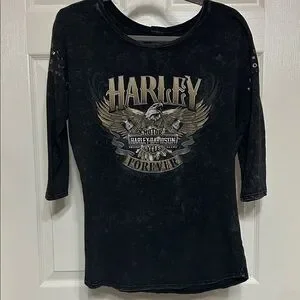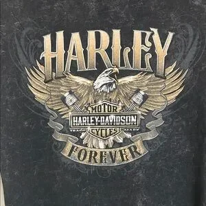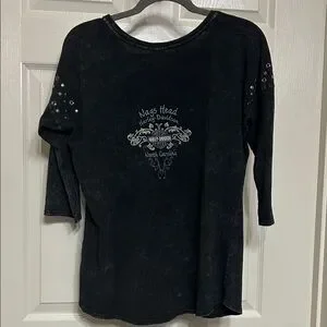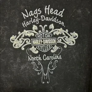 Classic and cool stonewash black tee featuring the iconic Harley-Davidson logo with eagle on front. Comfortable, soft and stylish, the back hit features the location where the top was bought brand new! Nags Head H.D. North Carolina.
