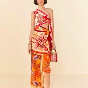 Vibrant one shoulder dress by FARM Rio: Mixed Scarves. Features bold orange and red patterns. The scarves tie the dress shut. If you tie them tighter could possibly be sized down. Silk dress. Perfect for a standout look. Worn once for my birthday.