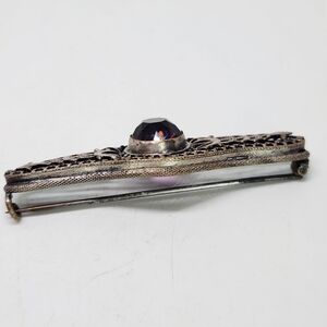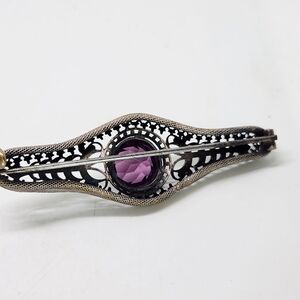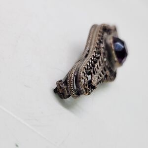 This exquisite brooch features a stunning purple gemstone set in a detailed silver design. Perfect for adding a touch of elegance to any outfit.