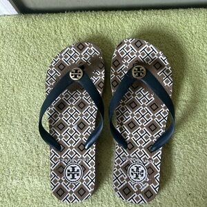 Tory Burch Geometric Print Flip Flops With navy Blue Straps.