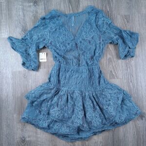 NWT Free People Lala Lace Sheer Reversible V-Neck Mini Dress Blue Tie Pullover