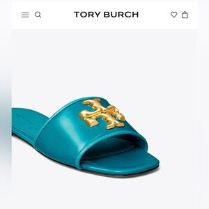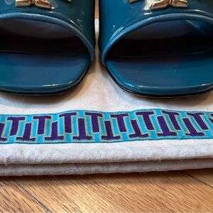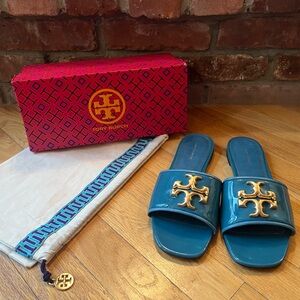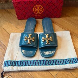AUTHENTIC & Gorgeous Tory Burch Patent Leather Eleanor Slides in Bayberry Blue (Teal)!