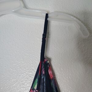 Pattern: Vibrant tropical floral print in shades of pink, red, and light blue over a deep navy blue background.