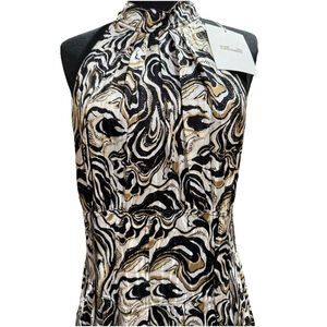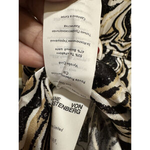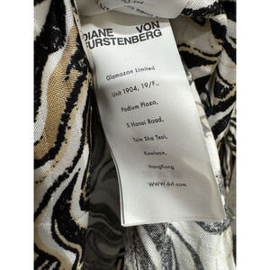 The Diane von Furstenberg NICOLA Marble Swing Midi Dress is a stylish and versatile piece perfect for various occasions such as travel, weddings, parties, and formal events. This sleeveless dress features a high neck halter neckline and a back zipper closure. The black marble pattern adds a touch of luxury to the garment, which is made from a viscose/rayon blend material. With accents like an inset waist, detachable d-ring belt, and pockets, this designer dress exudes a chic and elegant style that is sure to make a statement. No belt but it doesn’t change the fit of the dress because of how it’s cut. Perfect for summer and spring seasons, this dress is a must-have for any fashion-forward woman. Size 10 pit to pit 21.5” shoulder to hem 38”. This is not Target merchandise!