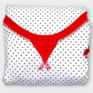 • Color: White with navy dots and red trim