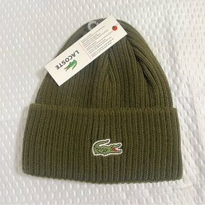 Lacoste Ribbed Knit Beanie Olive Green One Size Unisex Stretch Fit Hat Excellent