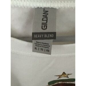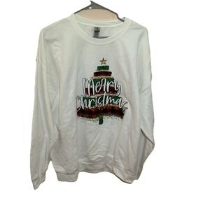 This Christmas Sweatshirt in size XL features a white color with a festive Merry and Bright design, perfect for the holiday season. Made from a comfortable cotton blend material, the sweatshirt has long sleeves and a crewneck style. Ideal for activewear, this unisex sweatshirt from Gildan is a great addition to your winter wardrobe, spreading some Christmas cheer with its theme.