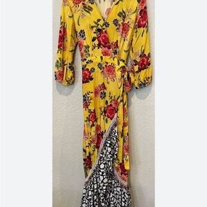 Embrace elegance with this stunning floral yellow wrap dress. Perfect for any occasion, it features a vibrant floral pattern that adds a touch of sophistication. Button at waist for wrap ease.