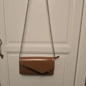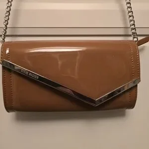 Stylish Steve Madden clutch with a glossy finish. Features a sleek metal accent and chain strap. pockets inside for credit cards