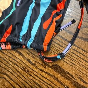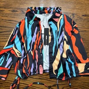 Vibrant button down shirt with bold stripes. Features a cropped design and adjustable drawstring hem. Perfect for a stylish look.