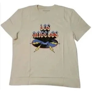 This Lucky Brand Los Angeles Records shirt is a men's size M casual skater street shirt in beige color. The shirt features a solid pattern with a crew neck and short sleeves, and is made of a polyester blend jersey fabric. It is accented with Lucky Brand's logo and showcases themes related to Los Angeles, music, streetwear, and more. The shirt is designed for a classic fit and is machine washable for easy care. Perfect for those looking for a stylish and comfortable addition to their wardrobe, this shirt captures the look and feel of a favorite vintage tee.