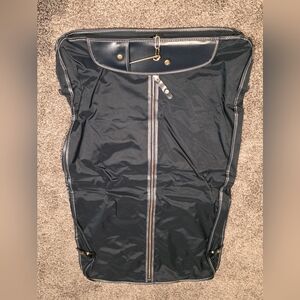 Very clean! Zipper closure, snap security! All hooks tuck away securely. Two interior hangers that attach nicely. Interior belt for garment restraint.