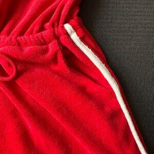 Vibrant red romper with white trim. Sleeveless design. Comfortable fit with adjustable waist tie.