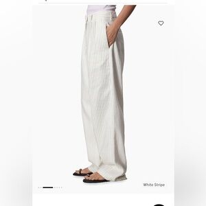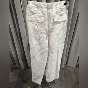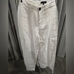 Chic white pinstripe vest and trousers set. Features a sleeveless vest with button closure. Wide-leg trousers for a relaxed fit. Ideal for stylish outings.