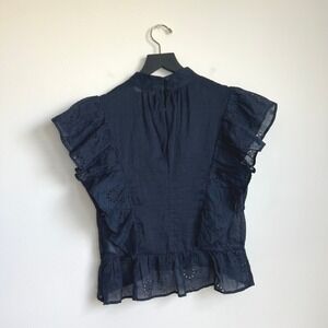 Frame Denim Sheer Ramie Eyelet Navy Blue Flutter Sleeve Boho Mock Neck Blouse Top