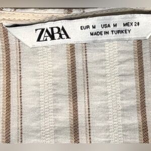 ZARA Striped White & Brown Tiered V Neck Midi Dress Linen Blend Size Medium