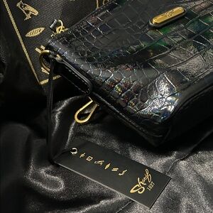 Gorgeous iridescent croc embossed leather bag by Sharif. It is a relatively small bag which makes it so versatile. It can be used as a cosmetic pouch by simply removing the wrist strap. It can be used as a clutch, or a wristlet with the wrist strap on or off and it comes with an amazing guitar strap which effortlessly snaps to each end with the brass hardware. It can be made into a cross body bag or a shoulder bag. Interior is lined with black fabric and you have two interior pockets and one zippered exterior on the back of bag. She is new with the tags and will arrive with a branded Dust Bag. Exquisite Bag