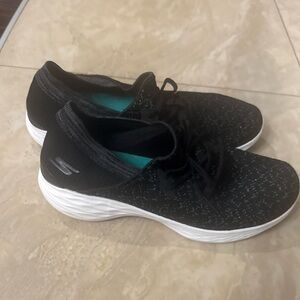Experience sleek style with these Skechers sneakers. Black upper with white sole. Ideal for casual outings.