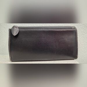 Sleek black leather clutch. Features gold turn-lock closure. Stylish Coach design.