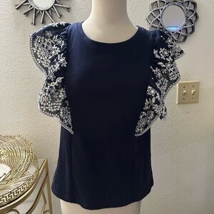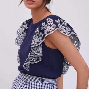 Chic navy blouse with white floral embroidery. Features ruffled sleeves. Perfect for stylish outings.