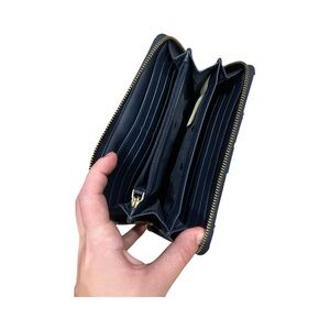Elegant wallet with bold floral pattern. Features navy, white, and red accents. Ideal for a stylish touch.